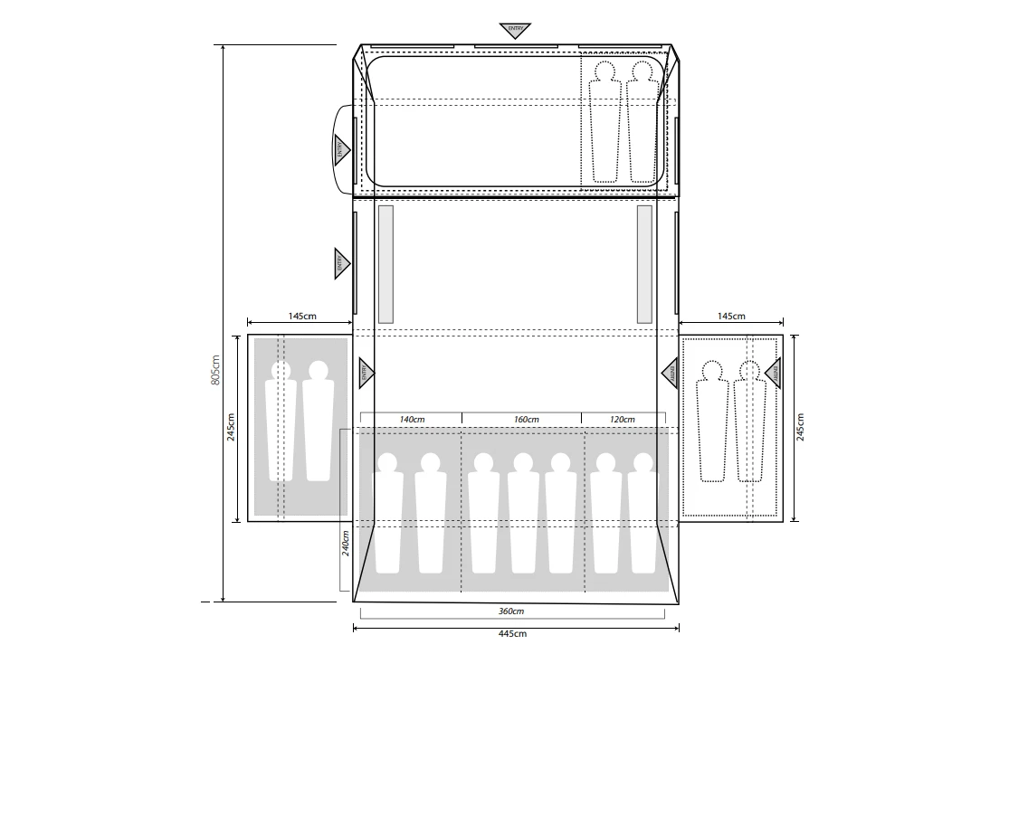 - Versatile Inner Bedrooms – splits into three compartments, with zipped dividers – or the inner pods can be used as one larger space. Furthermore, the inner has a depth of 240cm, ideal for larger camp beds or airbeds.