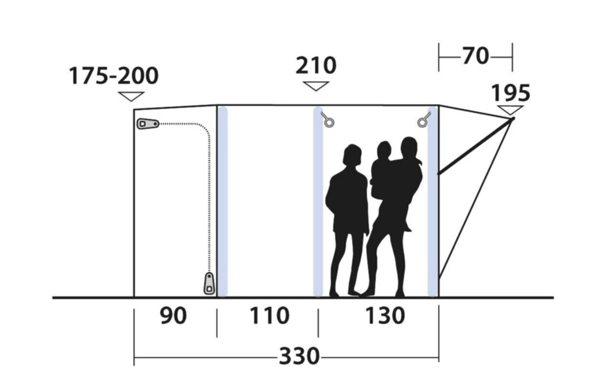 | Features | Designed for Campervans with a fitting height from 175-200cm. Large front door with additional insect mesh screen. HookTrack System allows versatile positioning of lights and other small accessories. Large tinted windows for a light-filled interior with curtains for privacy. Heavy Duty zips enhance performance. Large front canopy to provide shelter from rain and sun glare. Full open rear for easy access to vehicle. Pre-attached luminous guylines for convenience and fast pitching. Groundsheet for Link Access Zone with built-in draught excluder skirt. Optional dark-fabric inner for sleep or storage. |